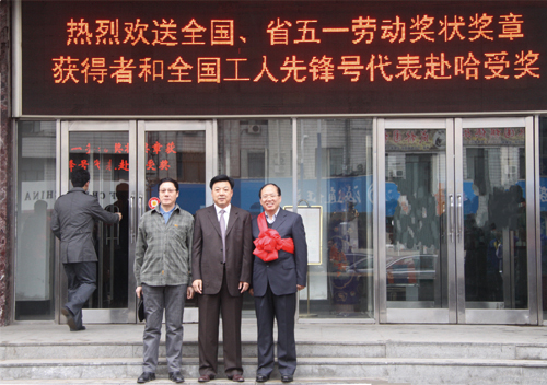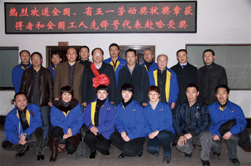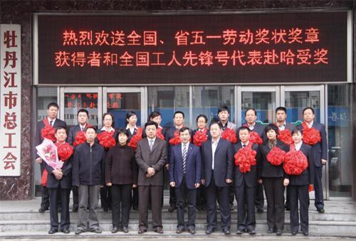 4月27日晨,市总工会主席姚寿鹏、市政府秘书长周景隆在市总工会门前为荣获全国、省五一劳动奖的全体人员送行,并合影留念。 姚主席、周秘书长分别发表了热情洋溢的讲话,并祝获奖者顺利愉快,同时也展现出牡丹江人的精神风采。