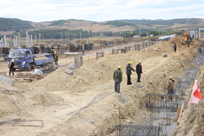 在牡丹江市郊东北、G11国道西侧,有一处破土动工的工业园区,这里彩旗招展,机械隆隆,此地就是牡丹江市对俄经济开发区光伏产业园区建设现场,数家施工企业在这块十几万平方公里的战场上相互比拼。由我公司承建的光伏园区8号标准化厂房,正以前所未有的速度加紧施工。该工程建筑面积为20880平方米,于2011年8月15日开工。